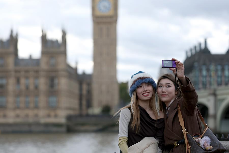 Duas turistas chinesas tiram selfie perto do Big Ben em Londres, Reino Unido, 5 de outubro de 2025. (Xinhua/Li Ying)