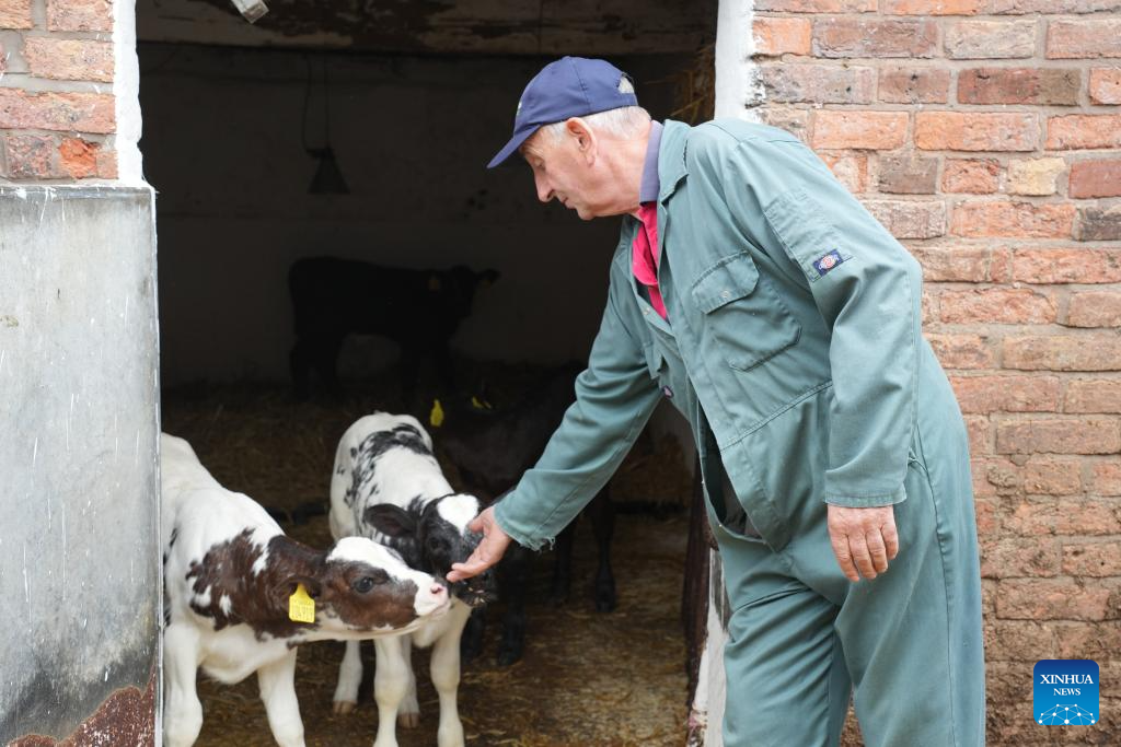 Rob Ford cuida de bezerros em sua fazenda leiteira em Cheshire, Inglaterra, Reino Unido, em 20 de agosto de 2025. (Xinhua/Zheng Bofei)