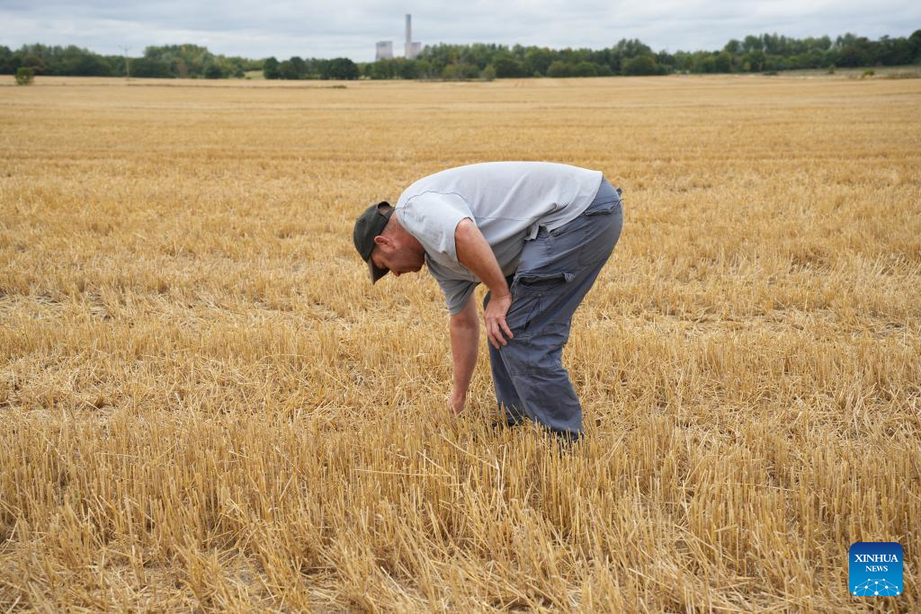 Rob Hilton verifica seu campo de cevada em Widnes, Inglaterra, Reino Unido, em 19 de agosto de 2025. (Xinhua/Zheng Bofei)