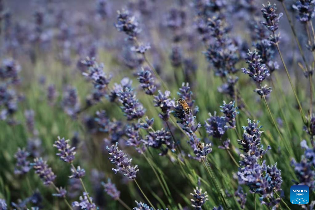 Lavanda ondula pela paisagem na Fazenda de Lavanda Mayfield, em Surrey, Inglaterra, Reino Unido, em 4 de julho de 2025. (Xinhua/Zhao Jiasong)
