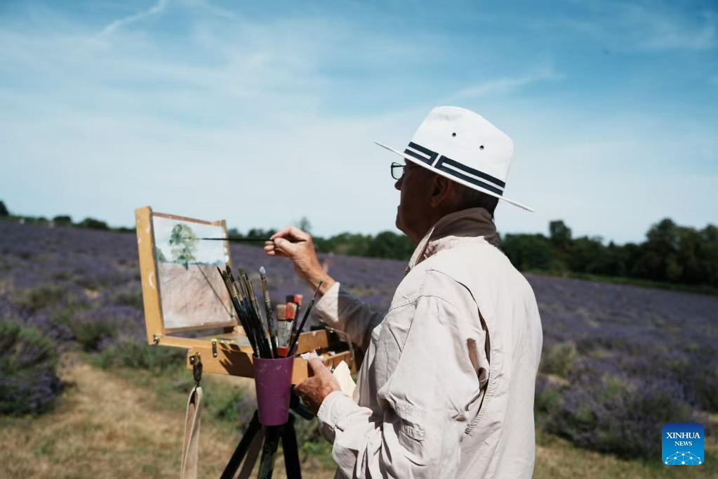 Visitante desenha na Fazenda de Lavanda Mayfield, em Surrey, Inglaterra, Reino Unido, em 4 de julho de 2025. (Xinhua/Zhao Jiasong)