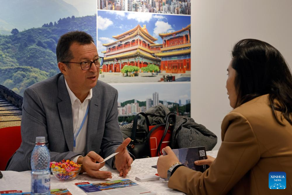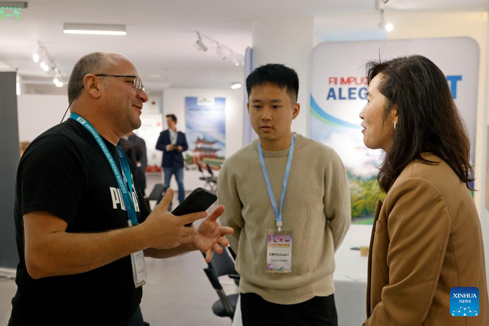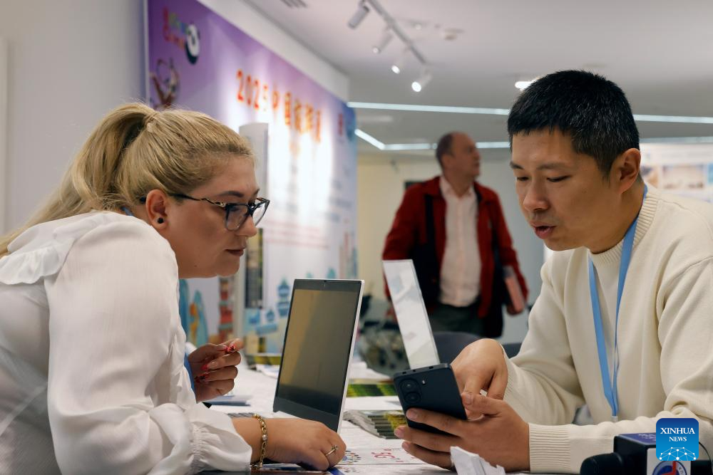 Funcionários da China e da Romênia compartilham experiências na Feira de Turismo da China 2025, em Bucareste, Romênia, em 10 de outubro de 2025. A Feira de Turismo da China 2025 começou na sexta-feira no Centro Cultural Chinês em Bucareste, reunindo mais de 100 representantes dos setores de turismo, cultura e educação da China e da Romênia. A feira de três dias, organizada pelo Centro Cultural Chinês em Bucareste e pela Associação Nacional de Agências de Viagens da Romênia, conta com 17 estandes dos setores cultural e turístico. Além de exposições de produtos turísticos, o evento tem uma área de consultoria "Estude na China", exibições de vídeos sobre turismo e experiências culturais, incluindo arte do chá, caligrafia e exposições de culinária chinesa. (Foto por Cristian Cristel/Xinhua)