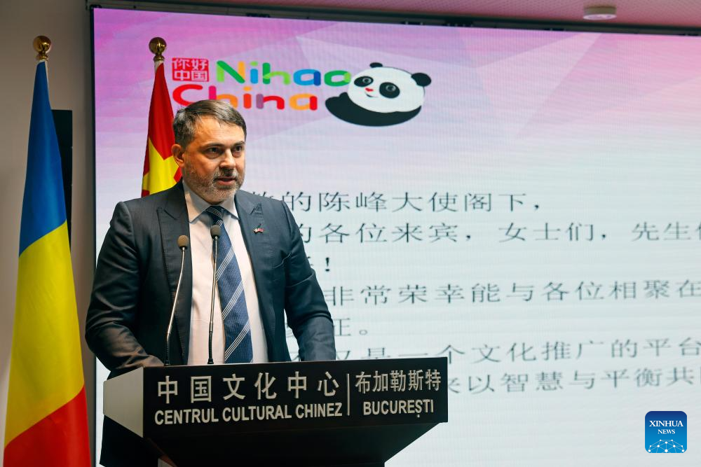 Alin Burcea, presidente da Associação Nacional de Agências de Viagens da Romênia, discursa na cerimônia de abertura da Feira de Turismo da China 2025, em Bucareste, Romênia, em 10 de outubro de 2025. A Feira de Turismo da China 2025 começou na sexta-feira no Centro Cultural Chinês em Bucareste, reunindo mais de 100 representantes dos setores de turismo, cultura e educação da China e da Romênia. A feira de três dias, organizada pelo Centro Cultural Chinês em Bucareste e pela Associação Nacional de Agências de Viagens da Romênia, conta com 17 estandes dos setores cultural e turístico. Além de exposições de produtos turísticos, o evento tem uma área de consultoria "Estude na China", exibições de vídeos sobre turismo e experiências culturais, incluindo arte do chá, caligrafia e exposições de culinária chinesa. (Foto por Cristian Cristel/Xinhua)