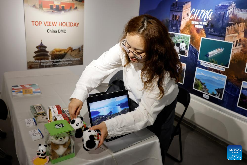 Funcionária aguarda visitantes na Feira de Turismo da China 2025, em Bucareste, Romênia, em 10 de outubro de 2025. A Feira de Turismo da China 2025 começou na sexta-feira no Centro Cultural Chinês em Bucareste, reunindo mais de 100 representantes dos setores de turismo, cultura e educação da China e da Romênia. A feira de três dias, organizada pelo Centro Cultural Chinês em Bucareste e pela Associação Nacional de Agências de Viagens da Romênia, conta com 17 estandes dos setores cultural e turístico. Além de exposições de produtos turísticos, o evento tem uma área de consultoria "Estude na China", exibições de vídeos sobre turismo e experiências culturais, incluindo arte do chá, caligrafia e exposições de culinária chinesa. (Foto por Cristian Cristel/Xinhua)