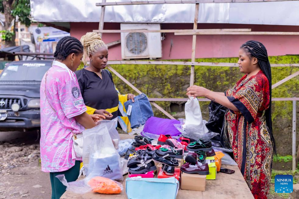 Elove Marie-Cleophas Messanga (direita) mostra roupas e sapatos adquiridos em plataformas chinesas on-line para pessoas em uma rua em Buea, capital da Região Sudoeste, Camarões, em 20 de setembro de 2025. (Foto por Muleng Timngum/Xinhua)