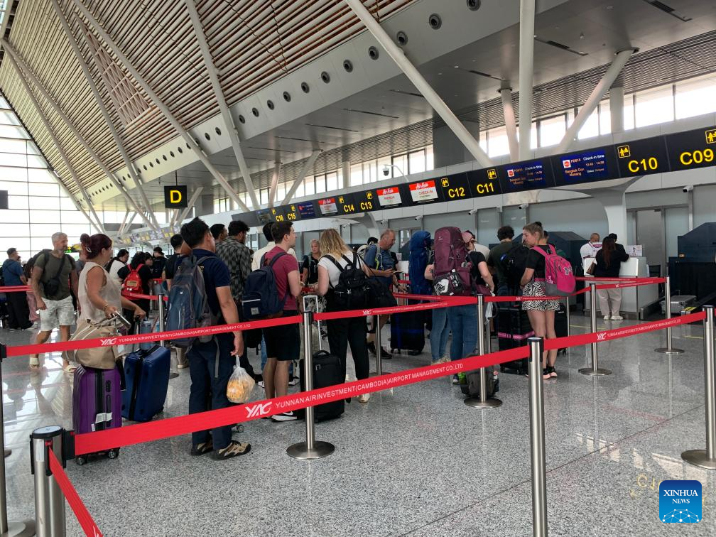 Passageiros em fila para fazer o check-in no Aeroporto Internacional de Siem Reap-Angkor, na província de Siem Reap, Camboja, em 16 de outubro de 2025. O Aeroporto Internacional Siem Reap-Angkor (SAI), com investimento chinês, comemorou na quinta-feira o segundo aniversário de suas operações. (Foto por Van Pov/Xinhua)