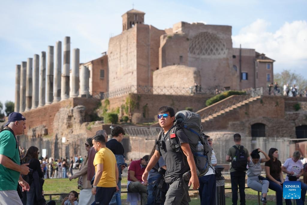 O viajante chinês Cheng Long visita o Monte Palatino em Roma, Itália, em 19 de outubro de 2025. (Xinhua/Ren Yaoting)