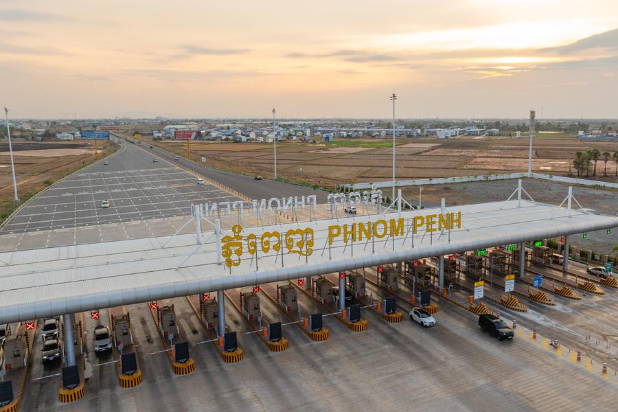 Foto aérea de drone tirada em 17 de março de 2025 mostra praça de pedágio de Phnom Penh na Rodovia Phnom Penh-Sihanoukville, no Camboja. A Rodovia Phnom Penh-Sihanoukville, um projeto da Iniciativa Cinturão e Rota, tem investimento da China Road and Bridge Corporation sob o modelo de construção-operação-transferência (BOT, na sigla em inglês) e é a primeira rodovia expressa do Camboja. (Xinhua/Cheong Kam Ka)