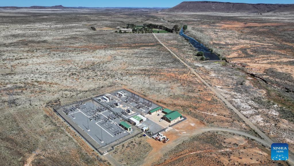Foto aérea de drone tirada em 22 de outubro de 2025 mostra subestação do Projeto de Energia Eólica de De Aar em De Aar, Cabo Setentrional, África do Sul. (Xinhua/Han Xu)
