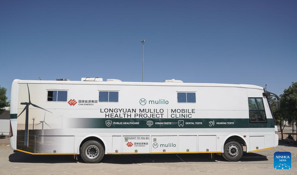 Foto tirada em 22 de outubro de 2025 mostra ônibus de clínica móvel adquirido pela Longyuan South Africa Renewables Ltd. em De Aar, Cabo Setentrional, África do Sul. (Xinhua/Han Xu)