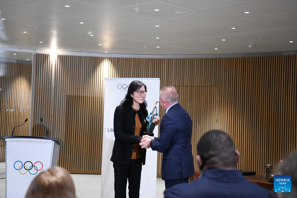 A treinadora chinesa de voleibol, Lang Ping, discursa após ser homenageada com o Prêmio de Reconhecimento pela Carreira de Treinadores do COI 2025, na Casa Olímpica em Lausanne, Suíça, em 24 de novembro de 2025. (Xinhua/Lian Yi)