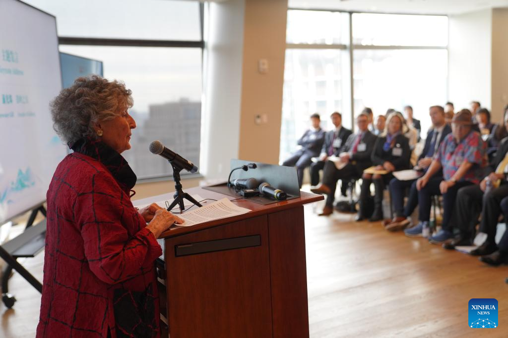 Adam Foster (2º à esquerda), fundador e presidente emérito da Fundação Helen Foster Snow, e sua filha (1ª à esquerda) conversam com Gordon Trimble (2º à direita), que recebeu o título "Amigo de Kuliang" e também venceu o Prêmio de Amizade do Governo Chinês, no Fórum Kuliang 2025 em Nova York, Estados Unidos, em 25 de novembro de 2025. (Xinhua/Zhang Fengguo)
