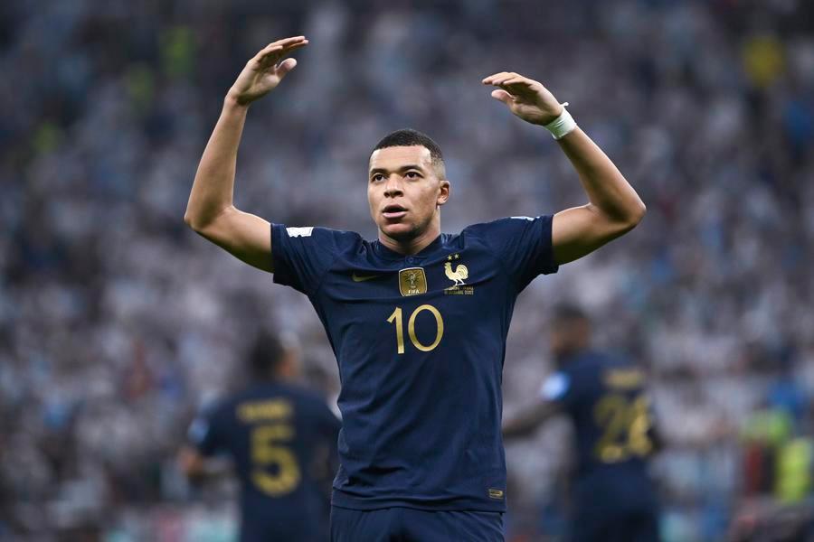 Kylian Mbappé, da França, comemora seu gol durante a final contra a Argentina na Copa do Mundo da FIFA 2022, no Estádio Lusail, em Lusail, Catar, em 18 de dezembro de 2022. (Xinhua/Li Ga)