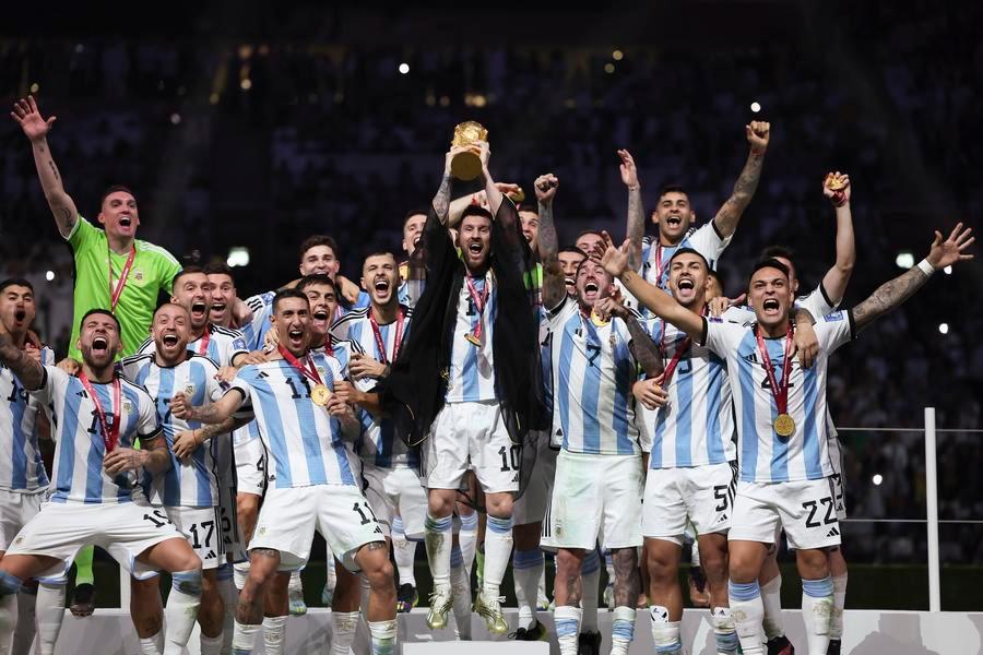 Lionel Messi (centro) da Argentina comemora com companheiros de equipe na cerimônia de premiação da Copa do Mundo da FIFA 2022 no Estádio Lusail, em Lusail, Catar, em 18 de dezembro de 2022. (Xinhua/Cao Can)