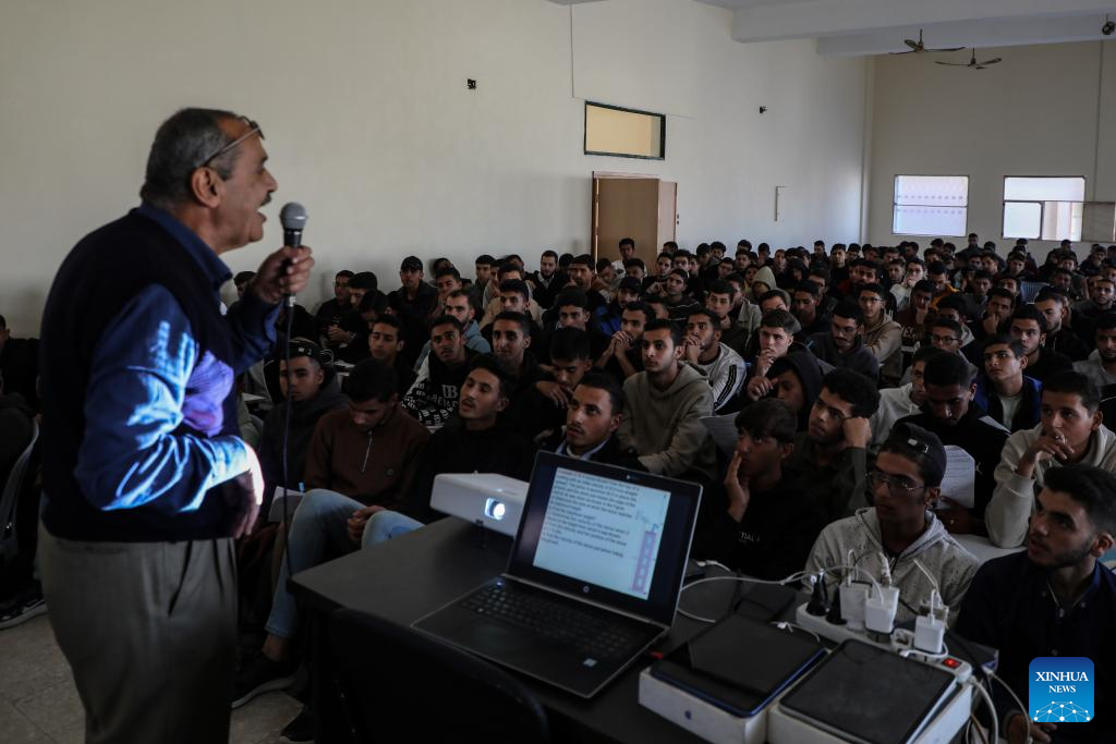 Professor dá aula na Universidade Islâmica, na Cidade de Gaza, em 7 de dezembro de 2025. (Foto por Rizek Abdeljawad/Xinhua)