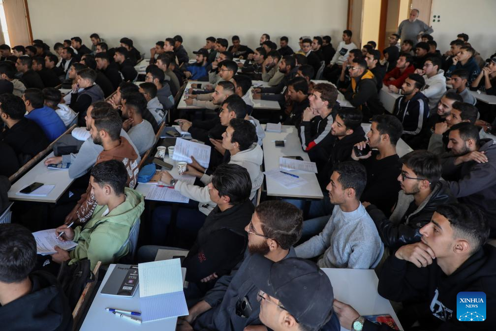 Estudantes palestinos assistem a uma aula na Universidade Islâmica, na Cidade de Gaza, em 7 de dezembro de 2025. (Foto por Rizek Abdeljawad/Xinhua)