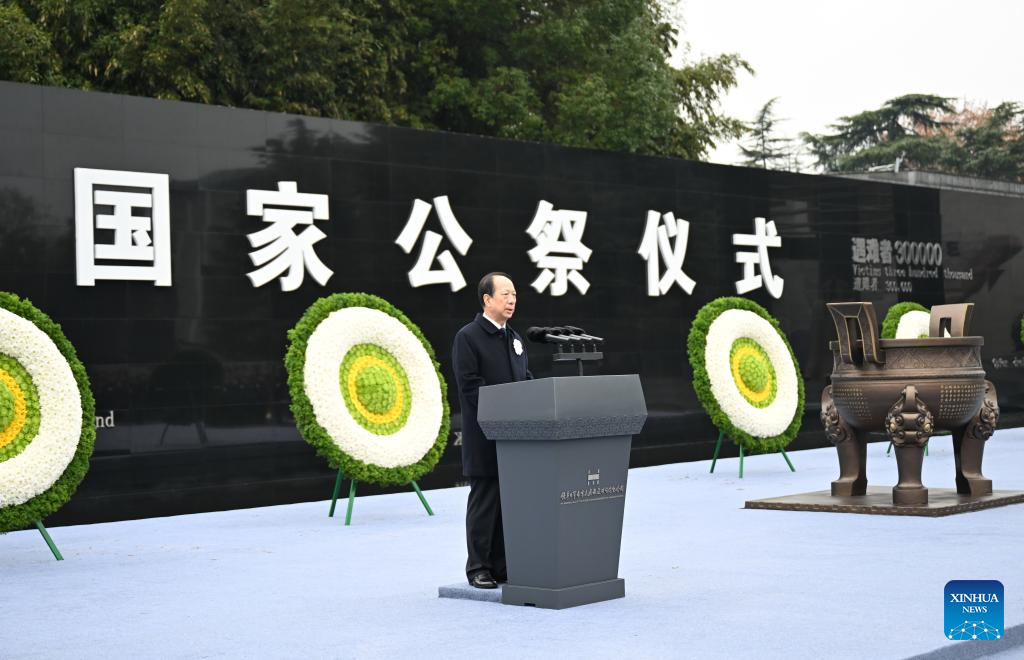 Shi Taifeng, membro do Birô Político do Comitê Central do PCCh e chefe do Departamento de Organização do Comitê Central do PCCh, fez o discurso durante uma cerimônia memorial nacional para lamentar as aproximadamente 300 mil vítimas do Massacre de Nanjing em Nanjing, capital da Província de Jiangsu, no leste da China.