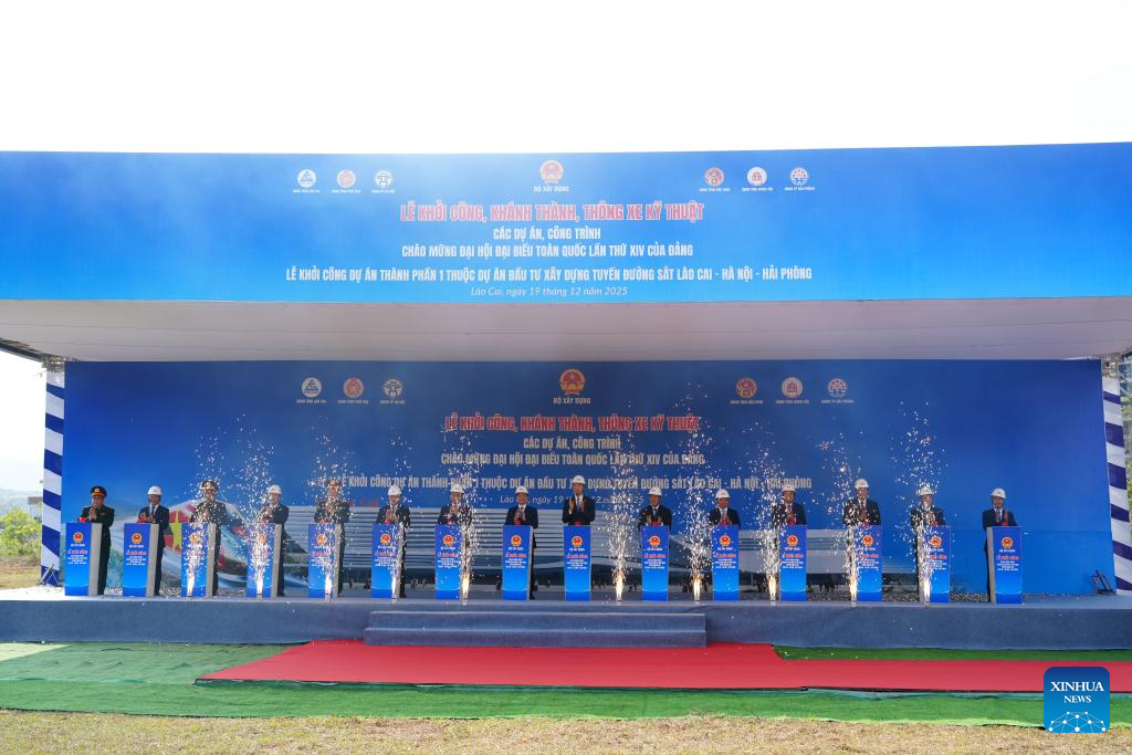 Delegados da China e do Vietnã participam da cerimônia de inauguração do primeiro trecho da ferrovia Lao Cai-Hanói-Hai Phong em Lao Cai, Vietnã, em 19 de dezembro de 2025. As autoridades vietnamitas iniciaram na sexta-feira a construção do primeiro trecho da ferrovia Lao Cai-Hanói-Hai Phong, um importante projeto que visa aprimorar a conectividade regional e promover o desenvolvimento econômico no norte do Vietnã.