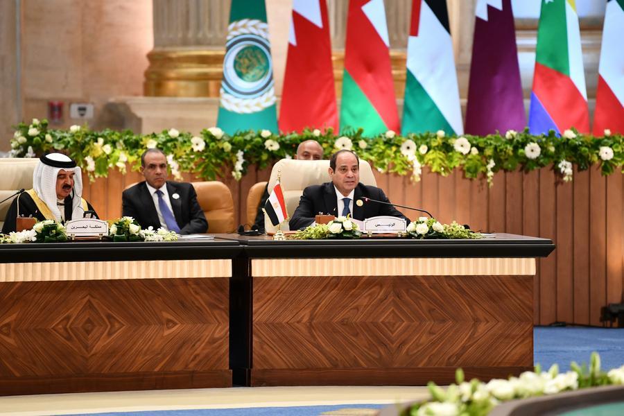 O presidente egípcio Abdel-Fattah al-Sisi (1º à direita) discursa na Cúpula Árabe Extraordinária - Cúpula para a Palestina, na Nova Capital Administrativa, Egito, em 4 de março de 2025. (Presidência Egípcia/Divulgação via Xinhua)