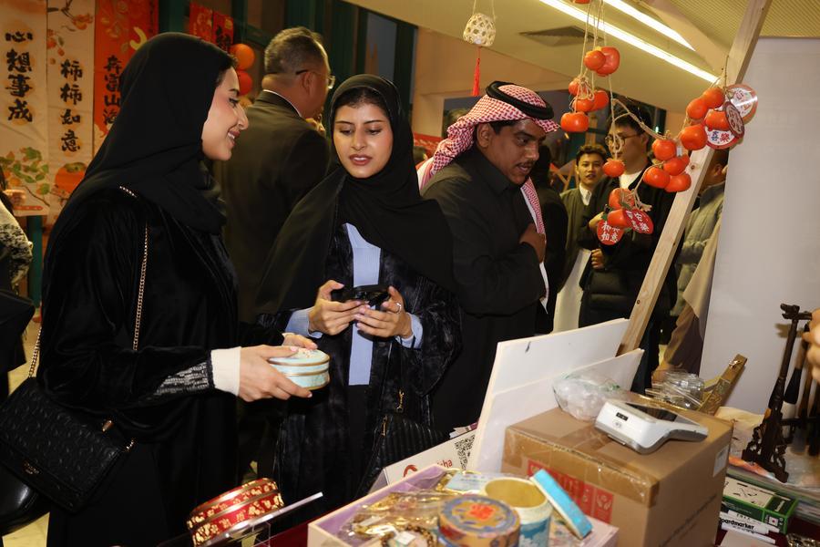Pessoas compram tradicionais estojos chineses de joias em um "Mercado da Festa da Primavera" realizado em Riad, Arábia Saudita, em 10 de janeiro de 2025. Com o tema "Recepcionando a Primavera, Comemorando Juntos o Ano Novo Chinês", o mercado foi organizado pela Embaixada da China na Arábia Saudita e concebido como uma feira tradicional de templo do Ano Novo Chinês. O evento também marcou o início das comemorações do 35º aniversário do estabelecimento das relações diplomáticas entre a China e a Arábia Saudita e do Ano da Cultura China-Arábia Saudita em 2025. (Xinhua/Wang Haizhou)