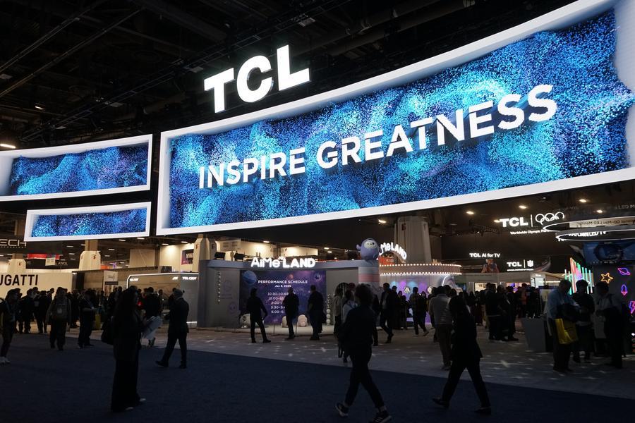 Visitantes observam área de exposição da TCL na Feira de Eletrônicos de Consumo (CES, na sigla em inglês) 2026 em Las Vegas, Estados Unidos, em 6 de janeiro de 2026. (Foto de Zeng Hui/Xinhua)