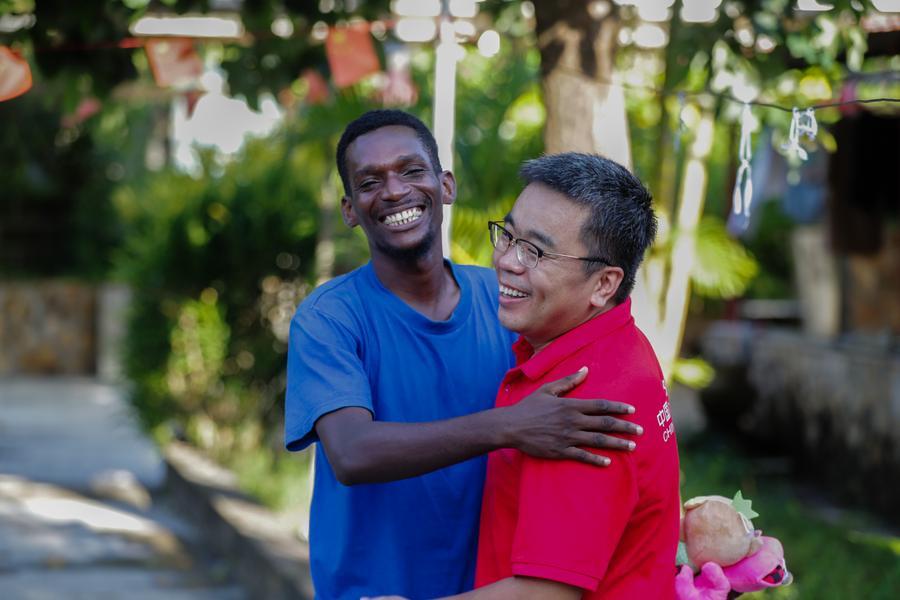 O médico tanzaniano, Harun Maisara Mahkum (esquerda), abraça He Zhilong, otorrinolaringologista da 35ª equipe médica chinesa em Zanzibar, no Hospital Abdulla Mzee, na Ilha de Pemba, Zanzibar, Tanzânia, em 1º de janeiro de 2026. (Xinhua/Emmanuel Herman)