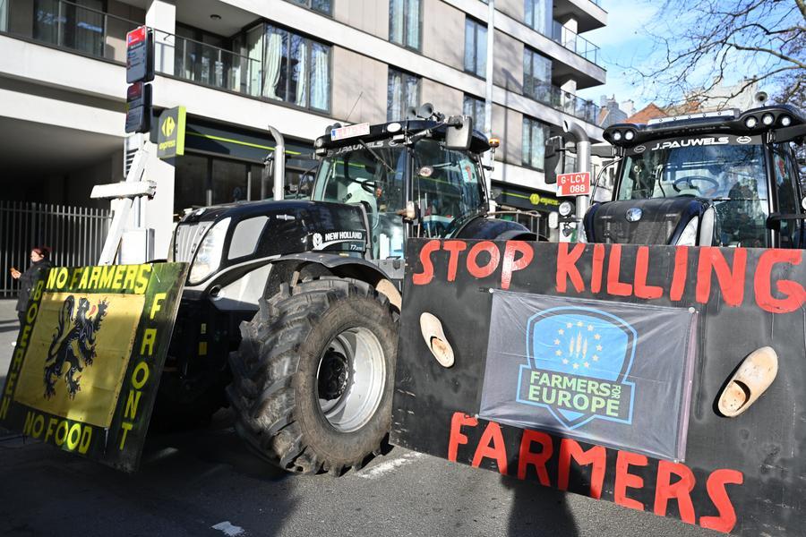 Tratores bloqueiam rua durante um protesto de agricultores perto do Edifício Europa, em Bruxelas, Bélgica, em 18 de dezembro de 2025. (Xinhua/Lyu You)