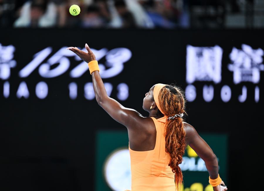 Coco Gauff faz saque durante sua derrota nas quartas de final do individual feminino contra Elina Svitolina no Australian Open, em 27 de janeiro de 2026. (Foto de Wang Shen/Xinhua)