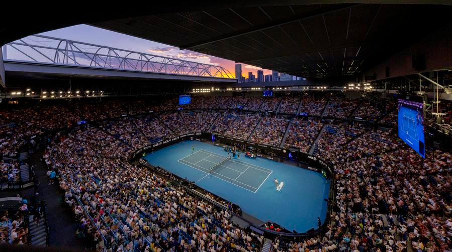 Vista aérea de Carlos Alcaraz jogando contra Alex de Minaur nas quartas de final do individual masculino do Australian Open em Melbourne, em 27 de janeiro de 2026. (Foto de Hu Jingchen/Xinhua)