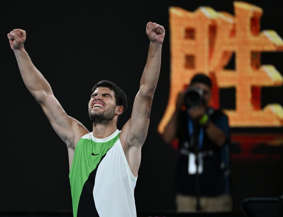 Alcaraz comemora após vencer De Minaur nas quartas de final do torneio do individual masculino. (Foto de Wang Shen/Xinhua)