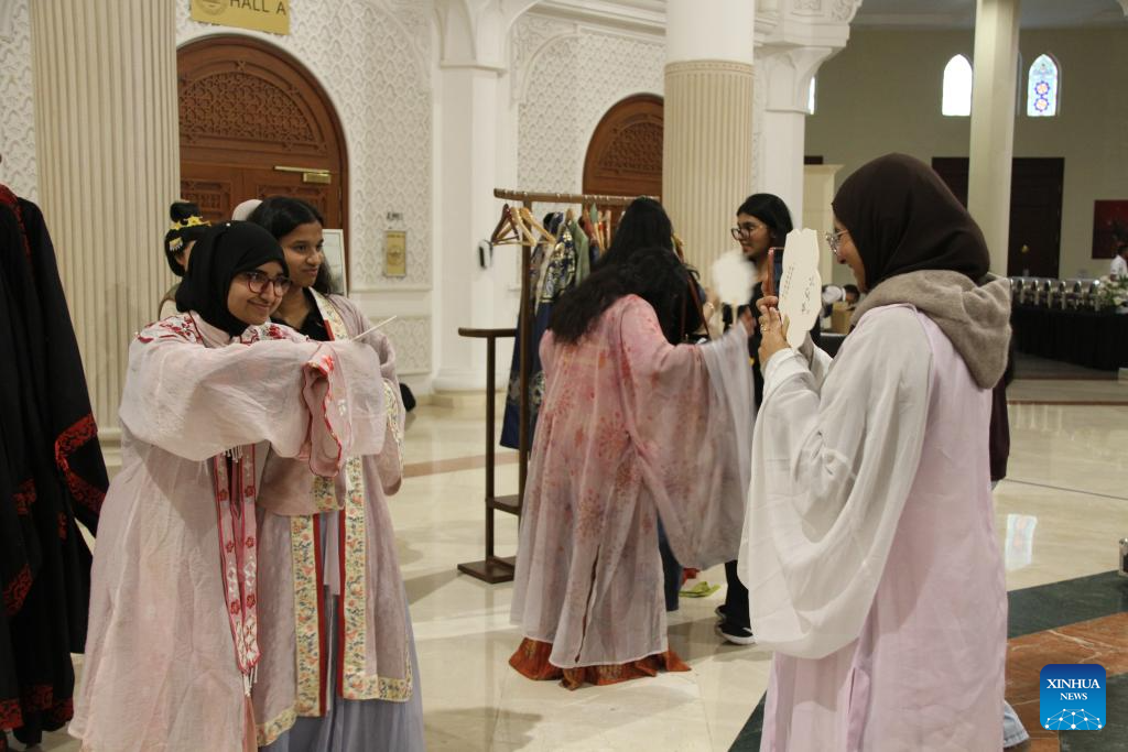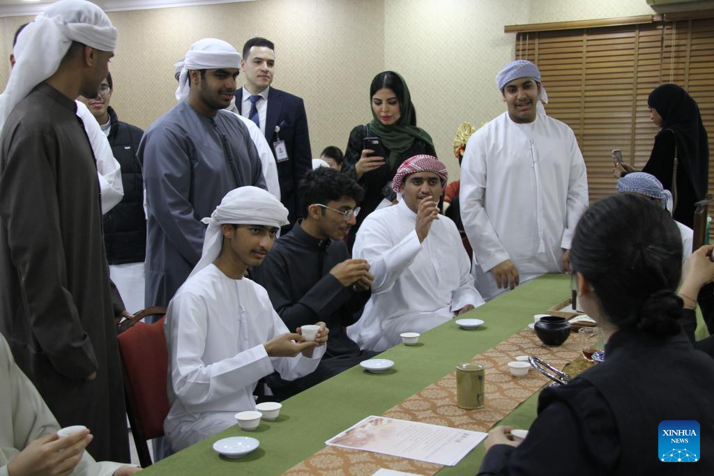 Na Universidade de Fujairah, Fares Feras Nehlawi vestiu um Hanfu preto (vestimenta tradicional chinesa) bordado com padrões de nuvens vermelhas e realizou um ritual tradicional do chá com elegância e precisão. Ele ergueu a xícara, inalou seu aroma rico e tomou um gole suave, saboreando um momento que parecia ter séculos de idade. Perto dali, estudantes faziam pintura chinesa, recorte de papel e confecção de leques de laca, ansiosos para compartilhar suas criações com os amigos.