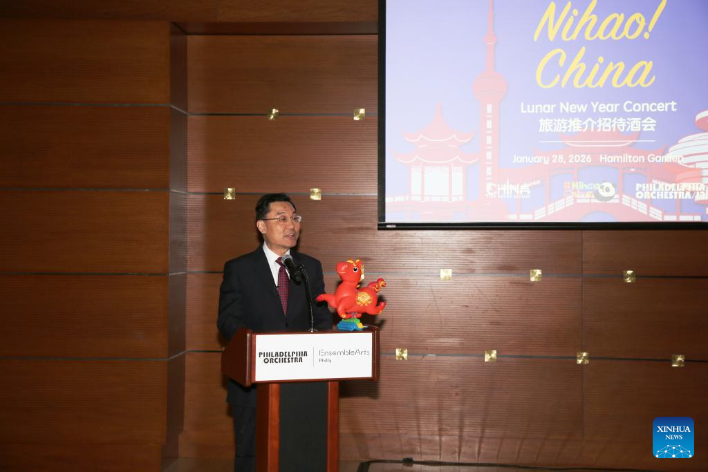 O embaixador chinês nos Estados Unidos, Xie Feng, fala durante o "Ni Hao! China" no Centro Kimmel de Artes Cênicas na Filadélfia, Pensilvânia, Estados Unidos, em 28 de janeiro de 2026. (Xinhua/Zhang Fengguo)