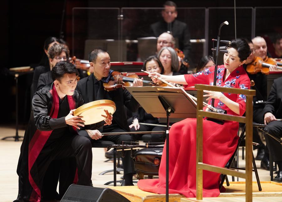 A musicista chinesa, Yu Hongmei, se apresenta em um concerto para o Ano Novo Lunar no Centro Kimmel para as Artes Cênicas, na Filadélfia, Estados Unidos, em 28 de janeiro de 2026. (Xinhua/Zhang Fengguo)