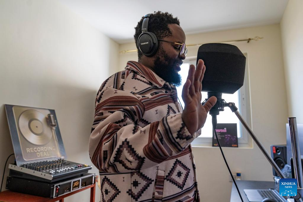 Fanuel Mulwa pratica canto em casa, no condado de Kajiado, Quênia, em 16 de janeiro de 2026. (Xinhua/Xie Jianfei)
