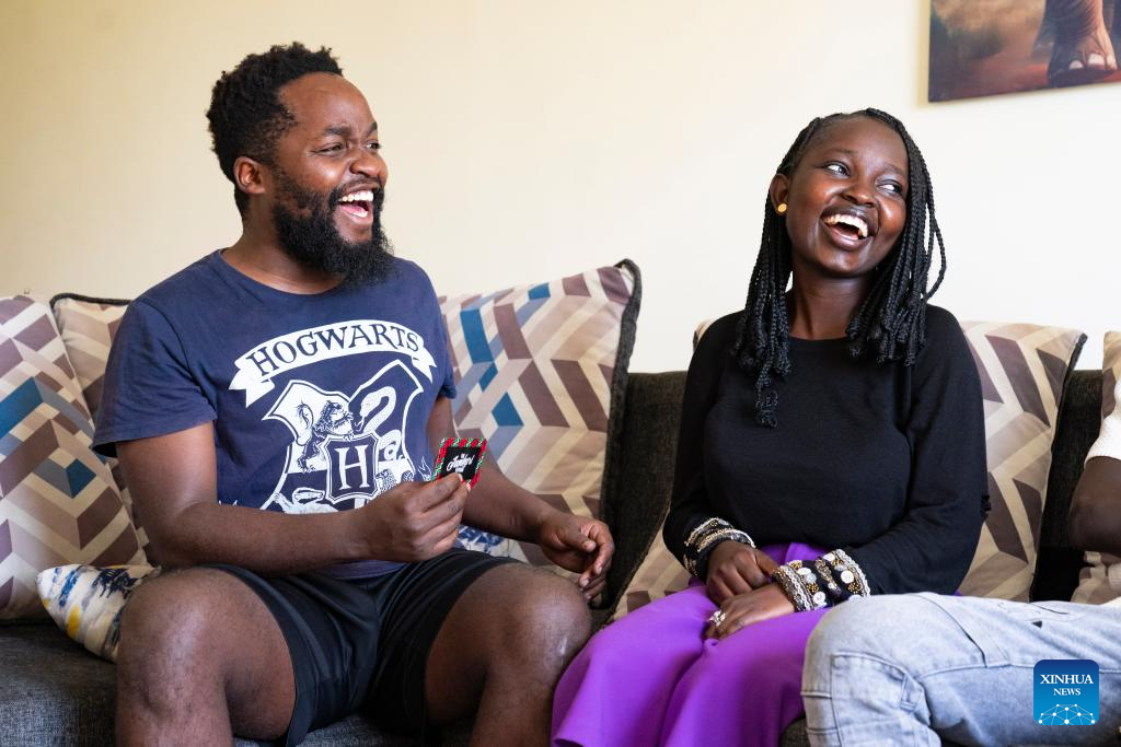 Fanuel Mulwa (esquerda) conversa com amigos em casa, no condado de Kajiado, Quênia, em 16 de janeiro de 2026. (Xinhua/Xie Jianfei)