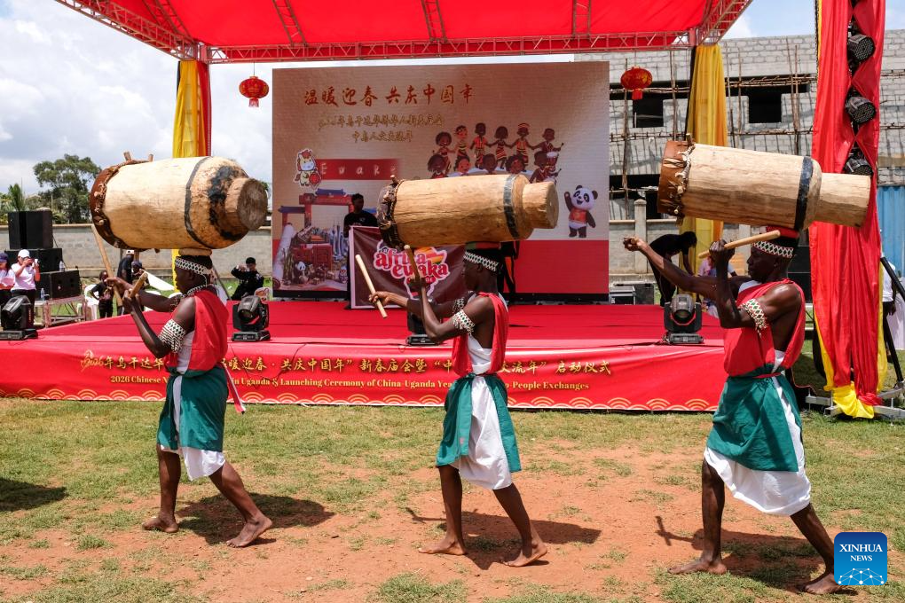 Artistas ugandeses se apresentam durante uma feira em um templo para marcar o lançamento do Ano de Intercâmbio Interpessoal China-Uganda e celebrar o Ano Novo Chinês, em Campala, Uganda, em 8 de fevereiro de 2026. Uganda lançou o Ano de Intercâmbio Interpessoal China-Uganda no domingo, na capital, Campala, durante uma feira em um templo realizada para celebrar o Ano Novo Chinês, também conhecido como Festa da Primavera. (Foto de Hajarah Nalwadda/Xinhua)