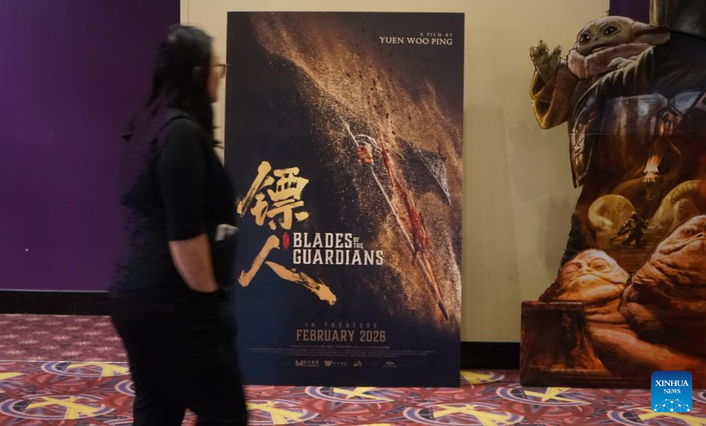 Espectadora passa por cartaz de "Blades of the Guardians" ("Lâminas dos Guardiões", em tradução livre), filme dirigido pelo lendário coreógrafo de ação Yuen Woo-ping, em um cinema em Monterey Park, Condado de Los Angeles, Califórnia, Estados Unidos, em 17 de fevereiro de 2026. Vários filmes chineses serão lançados na América do Norte durante o período do Ano Novo Chinês, também conhecido como Festa da Primavera, incluindo dois sucessos de bilheteria muito aguardados que estrearam na terça-feira, o Dia do Ano Novo Lunar Chinês. (Foto de Zeng Hui/Xinhua)