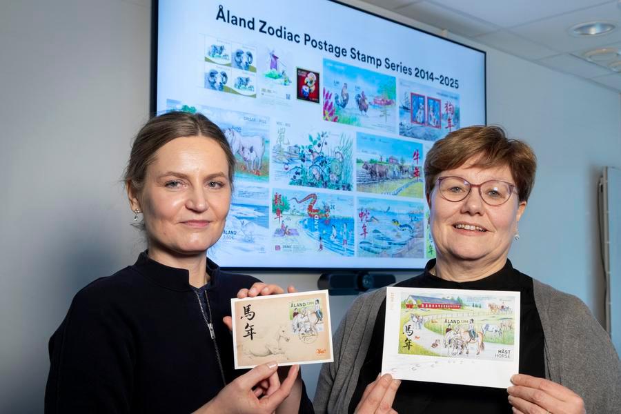 Funcionárias mostram selos e produtos postais com o tema do zodíaco do Ano do Cavalo na sede dos Correios de Aland, em Mariehamn, capital da região autônoma das Ilhas Aland, na Finlândia, em 21 de janeiro de 2026. (Foto de Matti Matikainen/Xinhua)