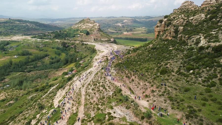 Foto aérea tirada por drone em 5 de março de 2026 mostra pessoas participando da Caminhada Moshoeshoe 2026 em Menkhoaneng, Lesoto. (Xinhua/Chen Wei)