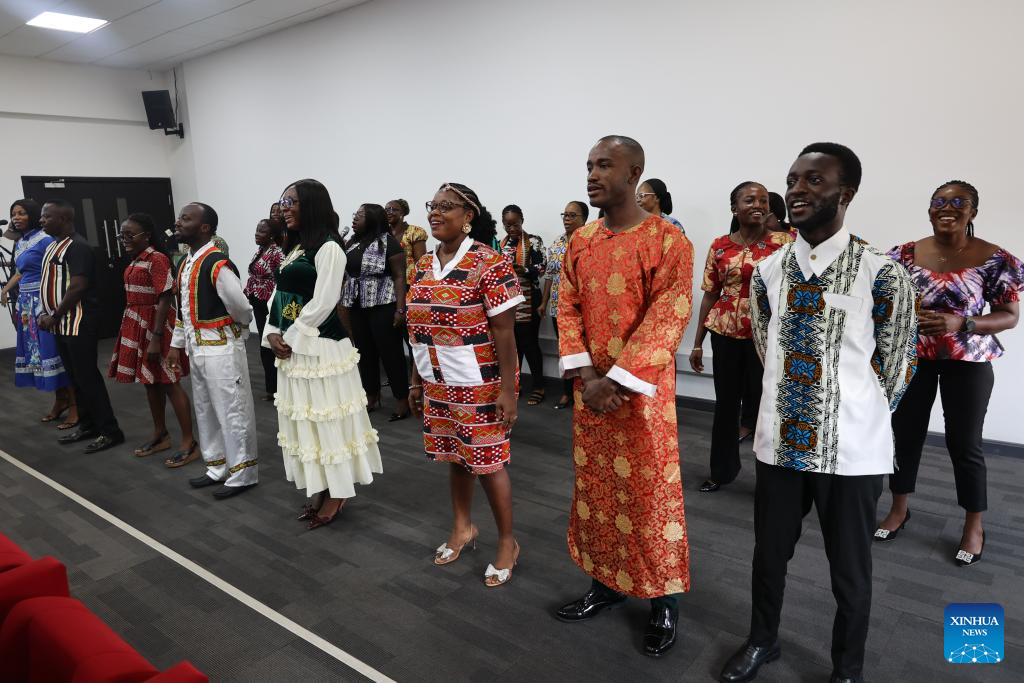 Estudantes ganenses recém-formados em um programa de treinamento em proficiência em língua chinesa cantam música chinesa na cerimônia de formatura em Acra, Gana, em 12 de março de 2026. Pelo menos 81 funcionários do setor público ganense do Ministério das Relações Exteriores e de outros ministérios, departamentos e agências se formaram na quinta-feira em um programa de treinamento em proficiência em língua chinesa com duração de 11 semanas. (Foto de Seth/Xinhua)