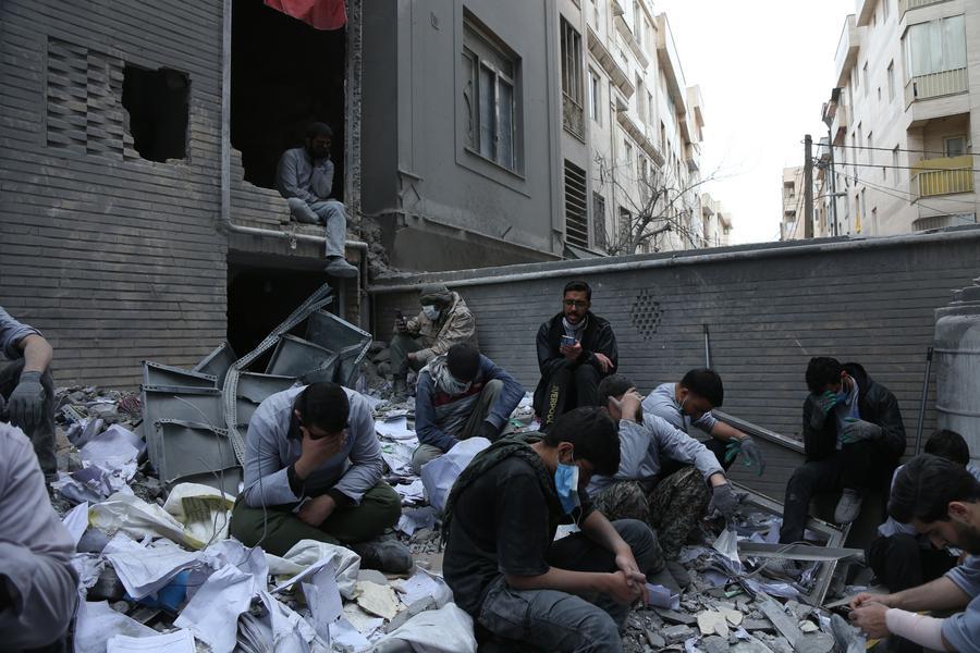 Pessoas se sentam sobre os escombros de prédios destruídos em uma área residencial de Teerã, Irã, em 15 de março de 2026. (Xinhua/Shadati)