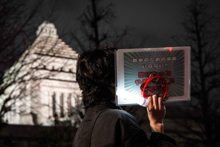 Pessoa com um cartaz participa de protesto em frente ao Segundo Prédio do Gabinete dos Deputados da Câmara dos Representantes, em Tóquio, Japão, em 24 de fevereiro de 2026. (Xinhua/Jia Haocheng)