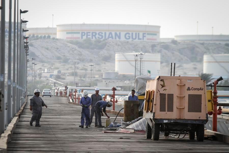 Trabalhadores petrolíferos iranianos são vistos na Ilha de Kharg, no Golfo Pérsico, sul do Irã, em 23 de fevereiro de 2016. (Xinhua/Ahmad Halabisaz)
