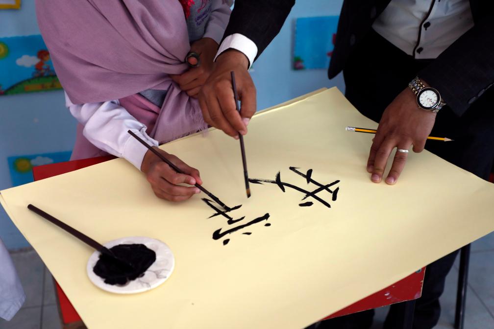 Estudantes aprendem a escrever caracteres chineses durante aula em uma escola em Sanaa, Iêmen, em 10 de fevereiro de 2020. (Foto de Mohammed Mohammed/Xinhua)