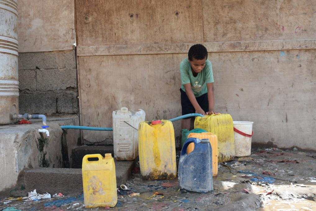 Menino deslocado enche galões com água potável em um campo de deslocados temporário nos arredores de Áden, no Iémen, em 11 de agosto de 2025. (Foto de Murad/Xinhua)