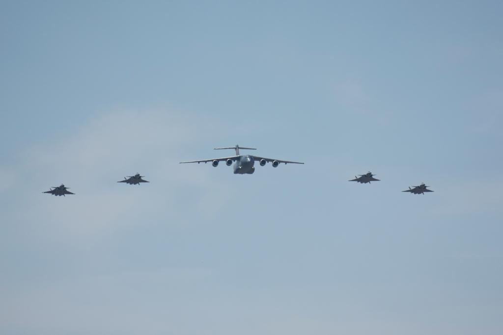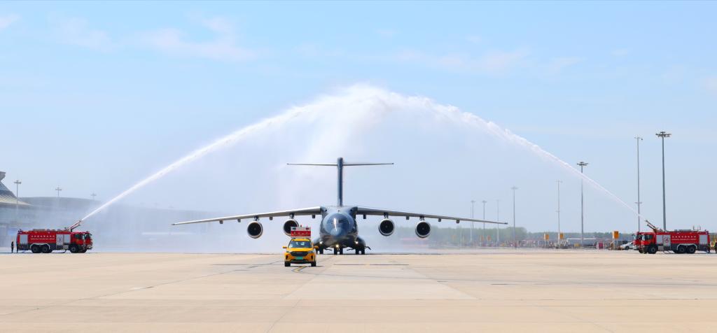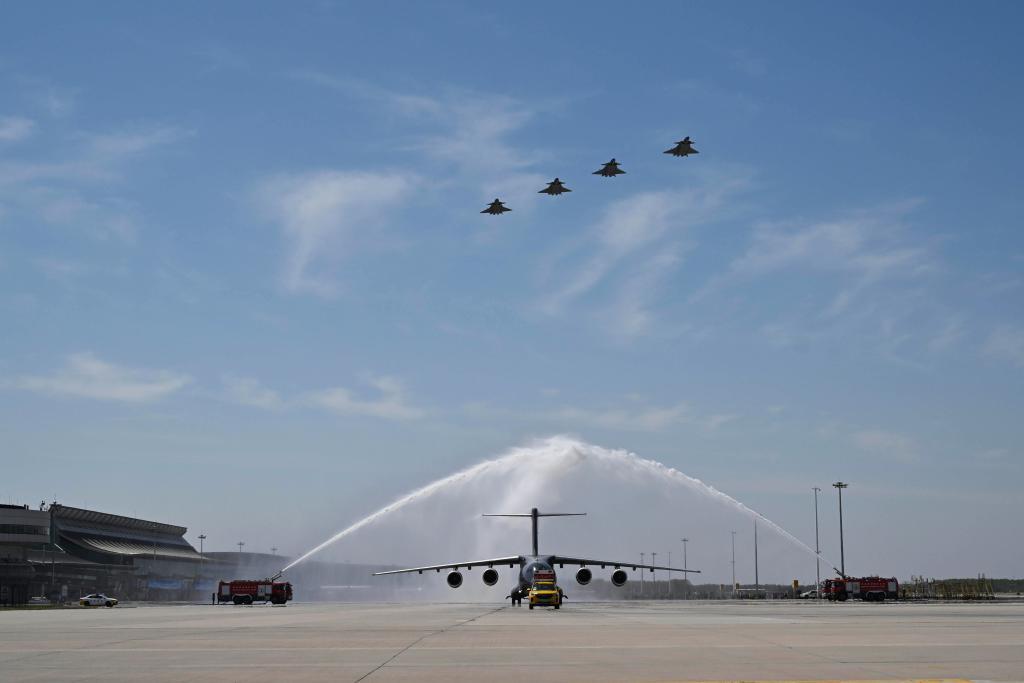 Depois de entrar no espaço aéreo da China, a aeronave de transporte Y-20B foi escoltada por quatro caças J-20. Ao pousar no aeroporto, ela recebeu uma saudação de água em homenagem aos heróis caídos.