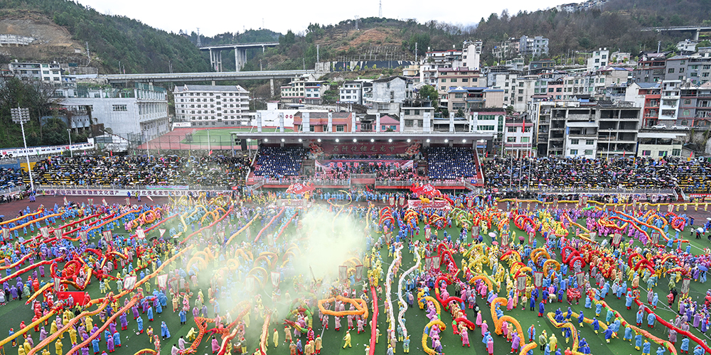 Moradores celebram "Festival Maolong" do grupo étnico Yilao com dança do dragão em Guizhou, no sudoeste da China